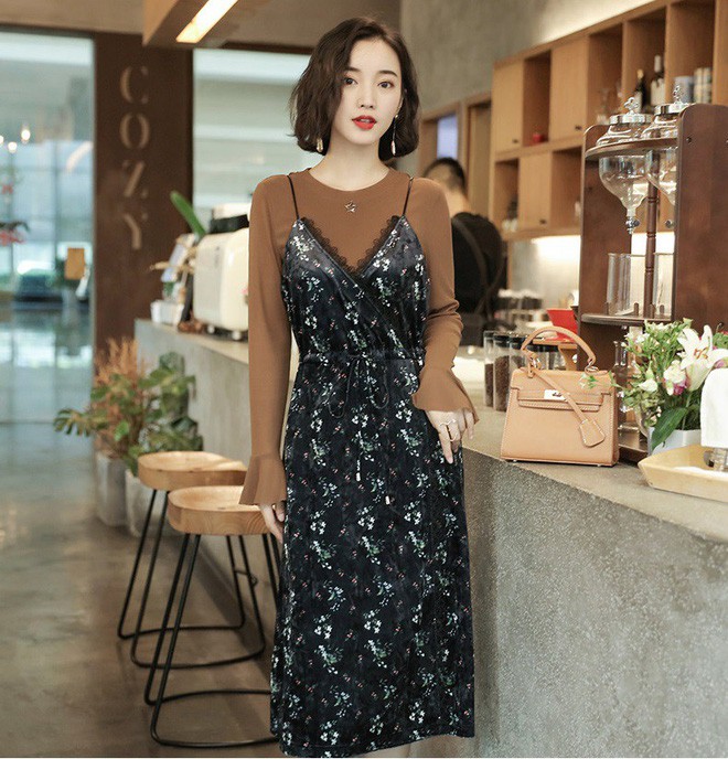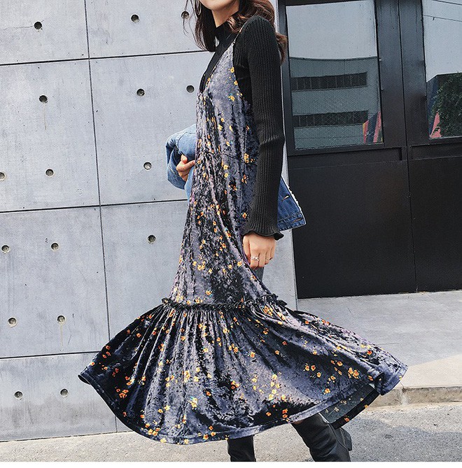 Váy 2 dây nhung dáng dài đang là item được "săn đón" nhiều nhất trong họ hàng váy nhung. Mẫu váy này cũng có cách mix tương tự như váy 2 dây, bạn có thể mix cùng áo phông, áo len hoặc áo sơmi. Bên cạnh đó, bạn cũng có thể chọn những mẫu váy ôm vải nhung, nhưng nên chọn những màu nhung sáng hoặc có thêm thắt họa tiết cách điệu, chiết eo để khiến váy nổi bật, trẻ trung hơn.