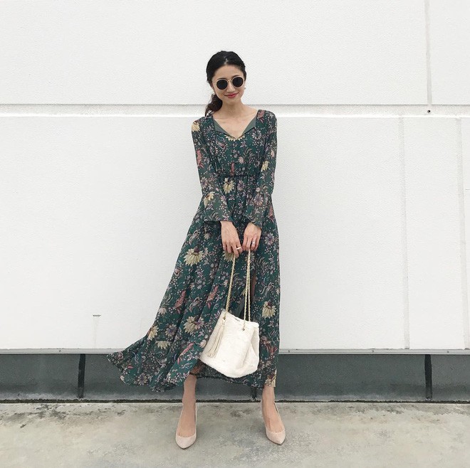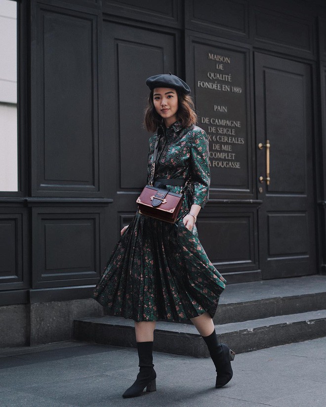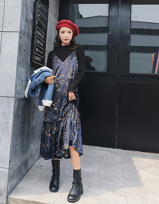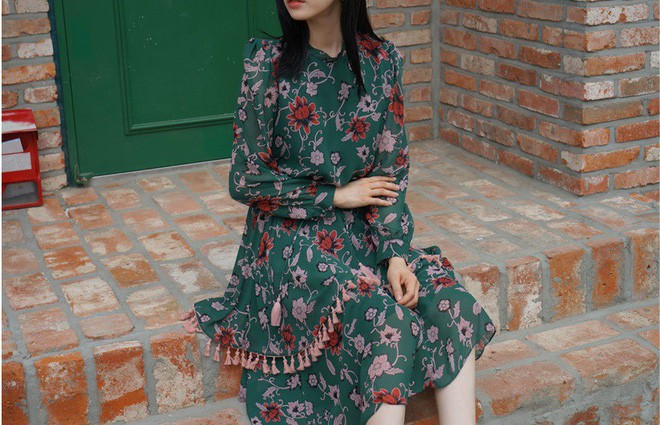 Váy hoa cho mùa thu đông năm nay thường thiên về những tông màu tối, trầm như xanh lá, xanh dương, nâu đất. Tuy vẫn thướt tha, yểu điệu nhưng lại mang cảm giác retro, cổ điển hơn hẳn những mẫu váy sáng màu của mùa hè. Váy hoa cũng là item rất dễ mix&match, bạn có thể tha hồ kết hợp cùng các loại áo khoác như áo trench coat, áo khoác da, áo dạ, áo len… thì đều hợp cả. Bên cạnh đó, nhiều cô nàng còn nhấn nhá thêm bằng các loại phụ kiện hợp thời như mũ nồi, boots da…