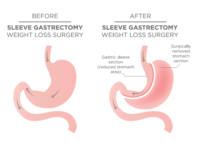 Từ dạ dày nguyên bản (ảnh trái), bác sẽ làm phẫu thuật cắt bỏ phần lớn dạ dày, khiến dạ dày nhỏ hơn và cơ thể cũng ít tiêu thụ thức ăn hơn trước (ảnh phải).