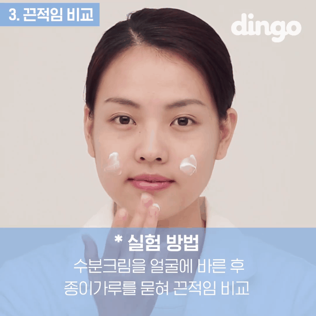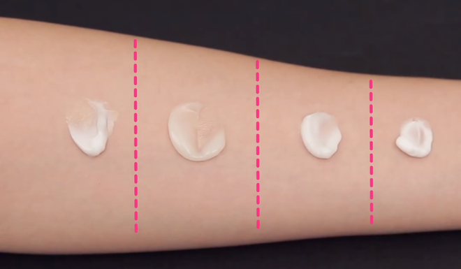 Tiếp theo, cô người mẫu sẽ thoa lần lượt 4 loại lên da, rồi dùng giấy thấm để kiểm tra xem loại kem nào thấm vào da nhanh hơn. Giấy càng bám ít thì càng chứng tỏ kem thấm nhanh, ít nhờn dính.