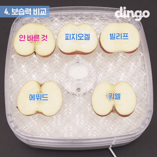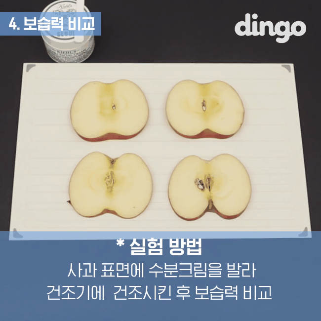 Sau 4 giờ, tiếp tục kiểm tra độ ẩm của táo. Miếng táo bình thường, không thoa kem dưỡng, độ ẩm giảm xuống chỉ còn 25%. Loại kem dưỡng có khả năng giữ ẩm vượt trội nhất là kem dưỡng của Belif, sau thời gian dài và ảnh hưởng của nhiệt độ,da vẫn giữ được độ ẩm cao, lên đến 51%. Tiếp theo đó, khả năng giữ ẩm lần lượt là kem dưỡng của Etude House, Physiogel và Kiehl’s.
