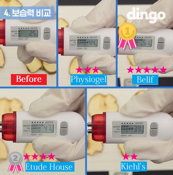 Trước và sau khi thoa lên da, sẽ dùng máy đo độ ẩm để kiểm tra khả năng cấp nước tức thì của mỗi loại kem. Trong đó, kem dưỡng của Kiehl’s được đánh giá cao nhất vì giúp da tăng đến 20% nước. Tiếp theo đó là kem dưỡng của Belif, Etude House và Physiogel.