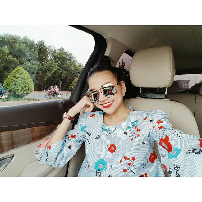 Thanh Hằng duyên dáng và tươi trẻ vô cùng với thiết kế áo hoa tay loe xinh xắn.