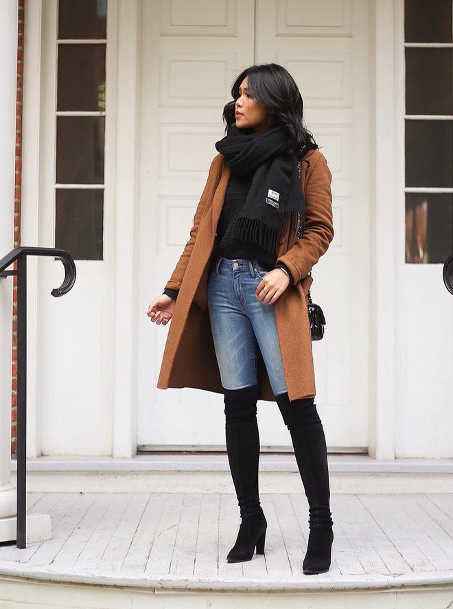 Phối boots cao cổ với quần jeans hay quần skinny hẳn là công thức mà nhiều cô nàng sẽ lắc đầu quầy quậy khi nghĩ đến, thế nhưng sự kết hợp này hóa ra lại tạo được set đồ cực kì thời trang và hài hòa. Vẫn là những những mẫu quần jean, quần skinny trơn đơn giản như bạn vẫn mặc hàng ngày, nhưng sự hiện diện thêm của 1 đôi boots cao cổ sẽ khiến set đồ trông thời trang hơn hẳn. Có 1 lưu ý nhỏ khi áp dụng công thức này là bạn nên chọn những mẫu áo mix cùng là những mẫu áo có dáng ôm, và sơ vin cùng với quần skinny để tổng thể set đồ được gọn gàng, hợp nhãn.