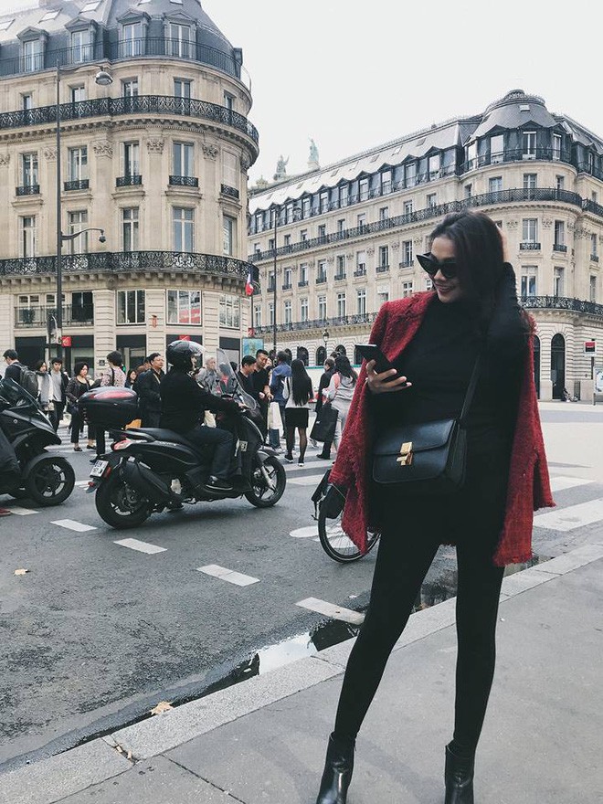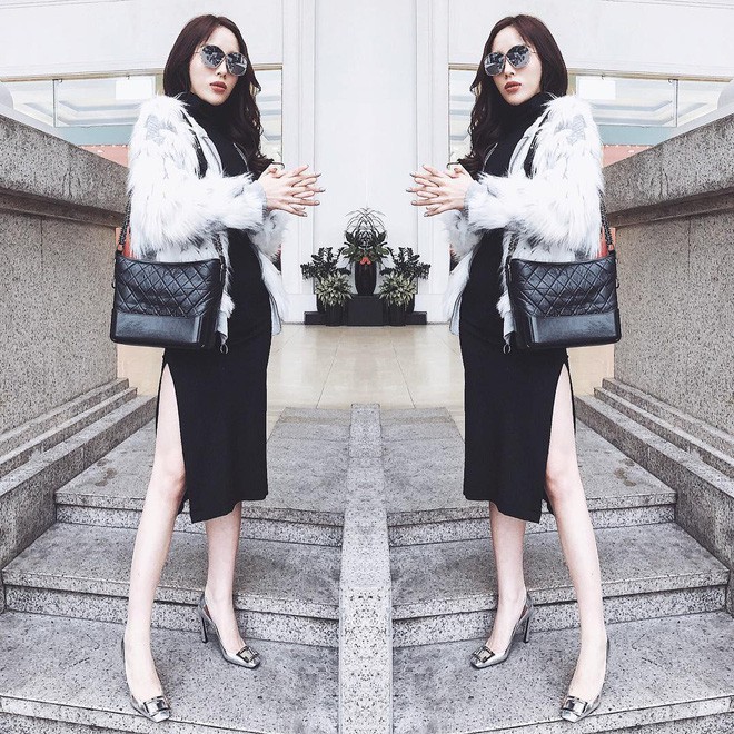 Thanh Hằng lại khác, người đẹp tối giản với nguyên một cây đen từ đầu tới chân, và chính cây đen này mà Thanh Hằng chọn áo khoác màu gì cũng hợp.