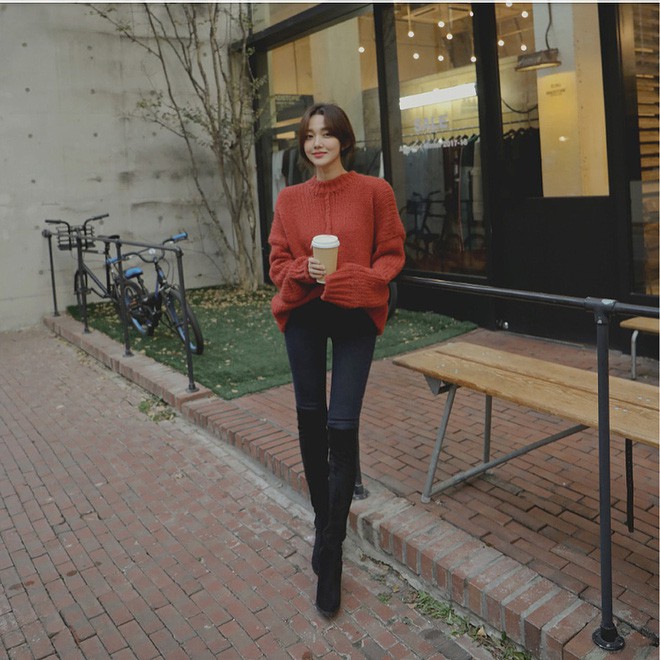 Combo "thần thánh" nhất mùa đông chính là áo len oversized và quần skinny jeans đơn giản, nhưng với cô nàng này lại khác, chỉ cần thêm đôi boots cao quá gối là tổng thể thời thượng hơn hẳn.