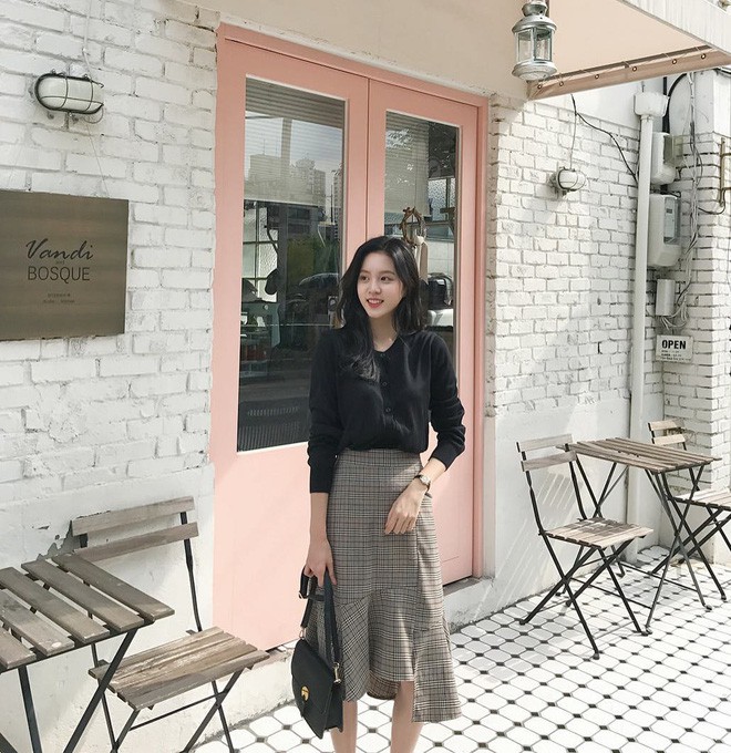 Cô nàng lại lại tiết chế mọi sụ nổi loạn cá tính, mà nhẹ nhàng tinh khôi với chân váy đuôi cá cách điệu sơ vin gọn gàng với sơmi đen đơn giản.