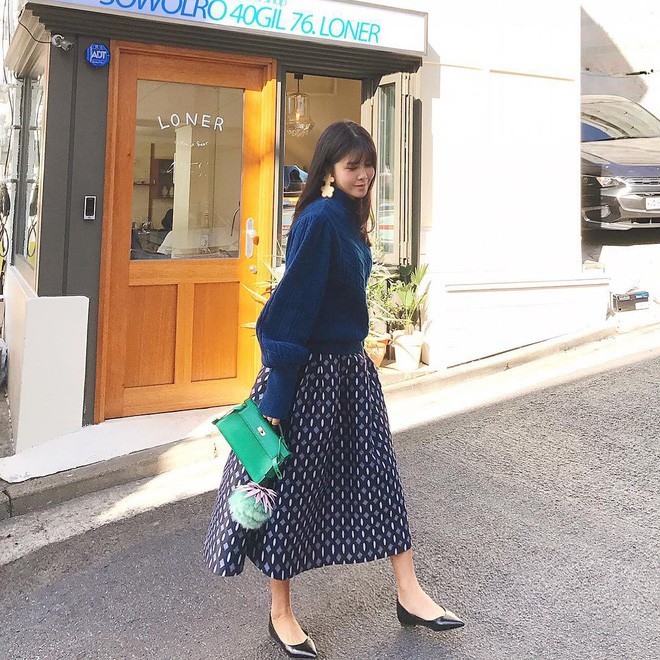 Với áo len dáng rộng, các nàng co thể học thêm quý cô này khi kết hợp áo len cùng chân váy midi cổ điển, đừng quên nhấn thêm phụ kiện tô điểm cho set đồ như quý cô này nhé.