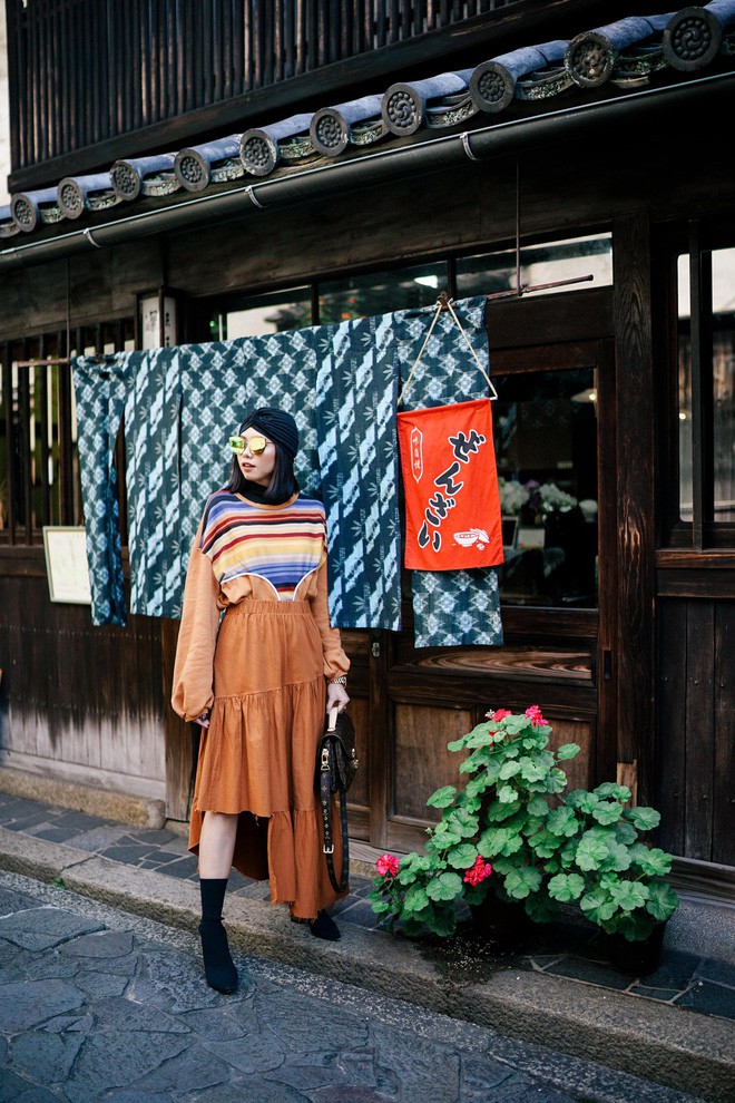 Cô nàng này lại chọn nhưng tông màu nâu trầm ấm của mùa thu để dạo phố tuần này. Tuy nhiên thay vì sự nền nã cổ điển thì set đồ của cô lại phá cách, nổi bật với kiểu dáng bất đối xứng của chân váy và thiết kế áo kẻ sọc sắc màu tươi tắn.