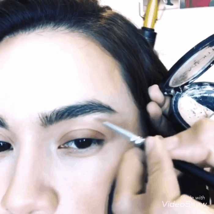 Cuối cùng là phần đuôi, dùng thêm cọ kẻ xác định đúng khuôn mày vuốt cong với phần đuôi vát, mảnh. Ngoài ra còn dùng thêm che khuyết điểm để chau chuốt đôi lông mày thêm sắc nét.