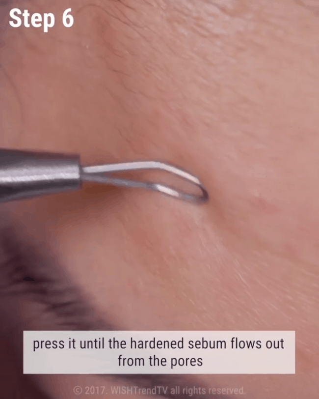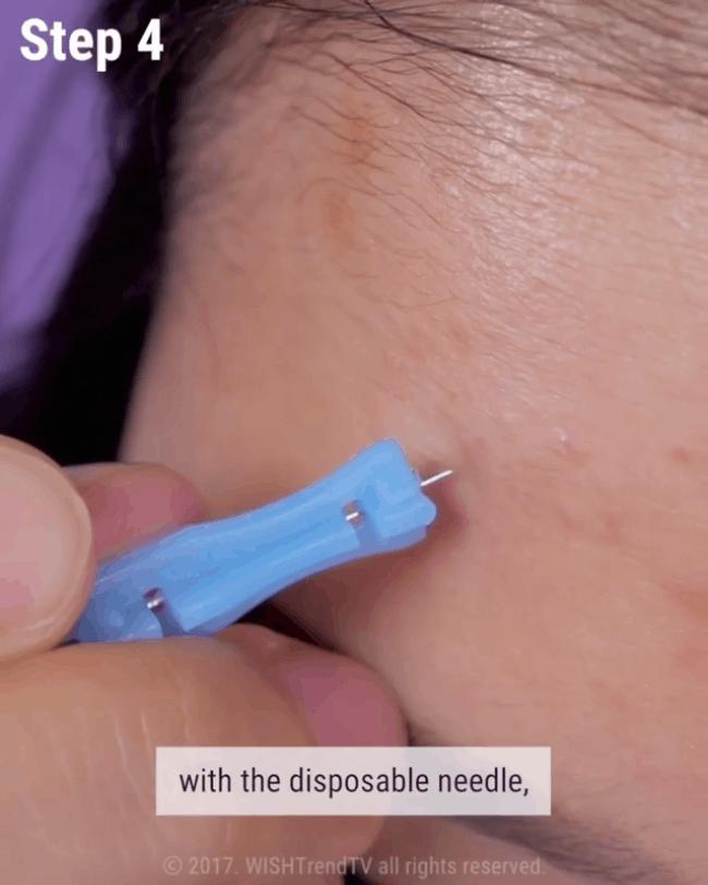 Bước 4: Dùng đầu kim tiệt trùng chấm nhẹ lên nốt mụn để tạo "miệng hở" giúp việc lấy nhân mụn được dễ dàng.