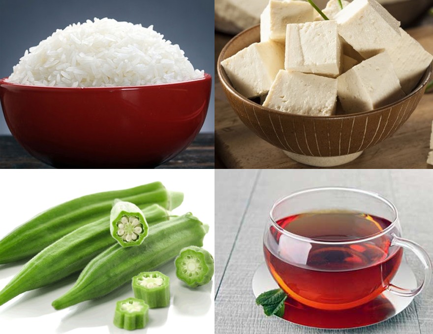 Thực đơn 1: Cơm nguội, đậu phụ, đậu bắp, trà gạo