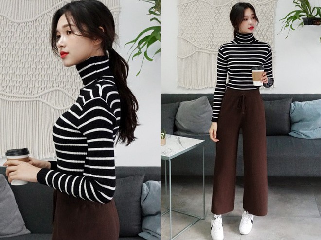 Những chiếc áo len gân sọc ôm khá dễ kết hợp trang phục. bạn có thể kết hợp cùng váy ba lỗ, quần jeans, quần âu, chân váy hay quần culottes đều đẹp.
