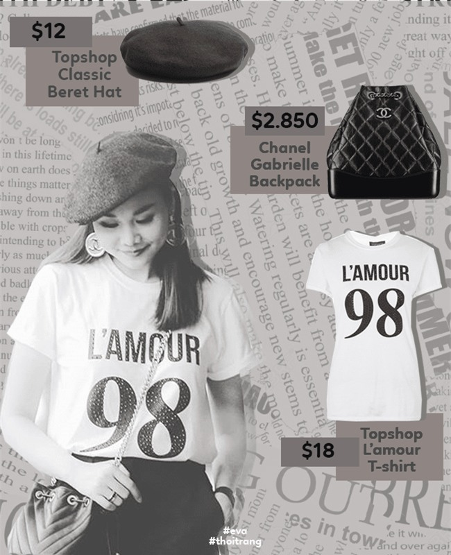 Nón beret thời thượng - "gương mặt thương hiệu" của làng phụ kiện thời trang cuối năm 2017 sẽ mang đến cho bạn vẻ ngoài vừa cổ điển lại chẳng kém phần sành điệu. Dù diện áo phông đơn giản đến từ Topshop nhưng chính chiếc túi Chanel Gabrielle mới là điểm nhấn hoàn hảo tạo nên một cây đồ hiệu chất hết nấc.
