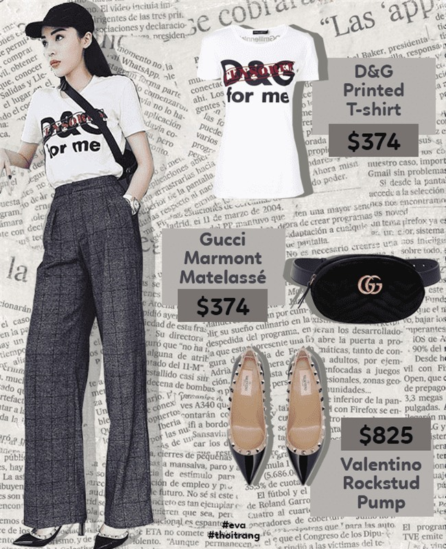 Bộ đôi quần sọc thanh lịch cùng thun trắng đơn giản đến từ thương hiệu D&G tưởng chừng sẽ khá mờ nhạt vì không có quá nhiều màu sắc lại mang đến hiệu ứng bất ngờ cho người đẹp Nam Định. Bởi sự kết hợp cùng giày cao gót Valentino cao cấp và chiếc túi Gucci đeo hông - món phụ kiện hot nhất thời gian qua đã giúp nâng tầm cả bộ cánh vốn đơn giản.