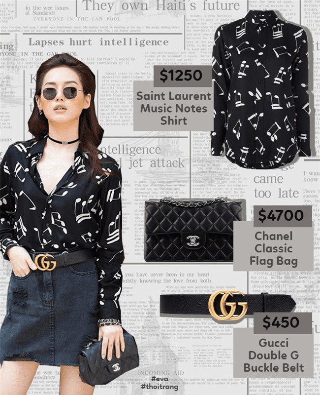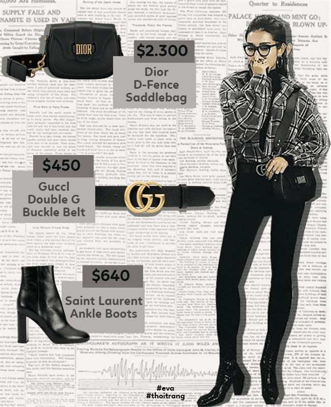 Một loạt những món phụ kiện "nóng bỏng tay" đều được đưa vào ứng dụng trong cây đồ chất lừ này: từ thắt lưng Gucci sang chảnh, ankle boots Saint Laurent sành điệu đón đầu xu hướng đến túi hiệu Dior.