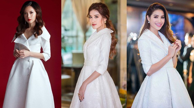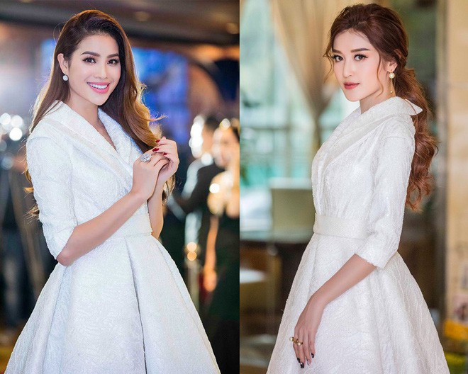 Trước đó không lâu, Phạm Hương đã từng diện thiết kế tinh khôi này. Khác với Huyền My, Phạm Hương để tóc xõa bồng bềnh lệch một bên, gương mặt trang điểm nhẹ nhàng rất hợp với phong cách của một Hoa hậu Quốc dân.