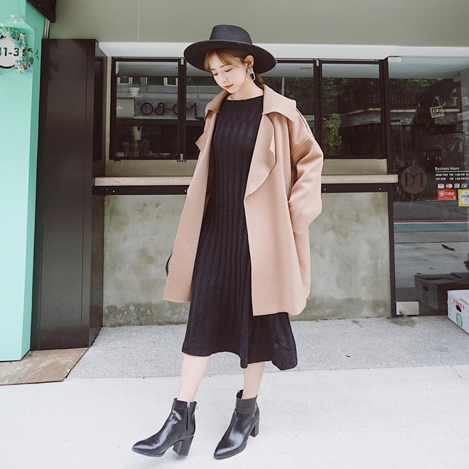 Nếu để tìm ra đâu là combo vừa ấm áp, chỉn chu lại đủ điệu đà, xinh xắn thì bạn sẽ chẳng thể bỏ qua việc mix áo khoác dáng dài với các loại váy liền. Ngoài những mẫu váy đặc trưng của mùa đông như váy len, váy dạ, váy nhung… thì bạn cũng có thể tận dụng những mẫu váy xinh xắn của mùa hè để diện trong combo này. Khi lên đồ, chỉ cần bổ sung thêm 1 đôi boots hay giày sneakers là bạn đã có được set đồ vừa ấm áp lại vừa sành điệu.