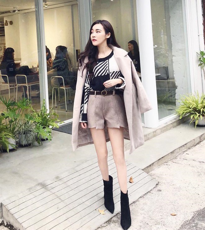 Trong trường hợp thời tiết không quá lạnh, hoặc bạn vẫn đang lưu luyến những mẫu quần shorts thoải mái của mùa hè, vậy thì combo áo khoác dáng dài + quần shorts sẽ là bộ đôi "hợp cạ" dành cho bạn. Đây cũng là combo giúp ăn gian chiều cao, tạo hiệu ứng khiến đôi chân trông dài ra đáng kể. Muốn diện combo này chỉn chu nhất, thì bạn chẳng thể bỏ qua những mẫu quần cạp cao hay quần dáng chữ A, rồi phối sơvin cùng các loại áo sơmi hoặc áo len ôm tôn dáng.