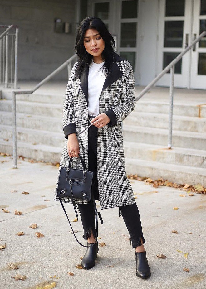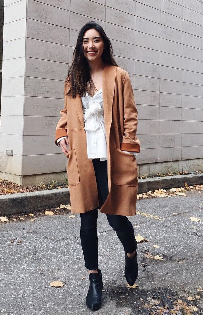 Áo khoác dáng dài mix cùng quần skinny hẳn là công thức quen thuộc đối với nhiều cô nàng. Công thức này dù cơ bản nhưng đảm bảo luôn đem lại set đồ gọn gàng, đẹp mắt, nàng nào mặc cũng hợp. Chẳng cần gì cầu kì, chỉ cần diện 1 chiếc áo len dệt kim, áo nỉ hay áo phông, thêm 1 chiếc quần skinny đơn giản, và khoác thêm 1 chiếc áo khoác dáng dài bên ngoài là bạn đã có được set đồ chỉn chu, thanh lịch. Về khoản giày dép thì bạn cũng không cần lo lắng quá nhiều, giày búp bê, giày cao gót, sneakers, boots cũng đều hợp với combo này cả.