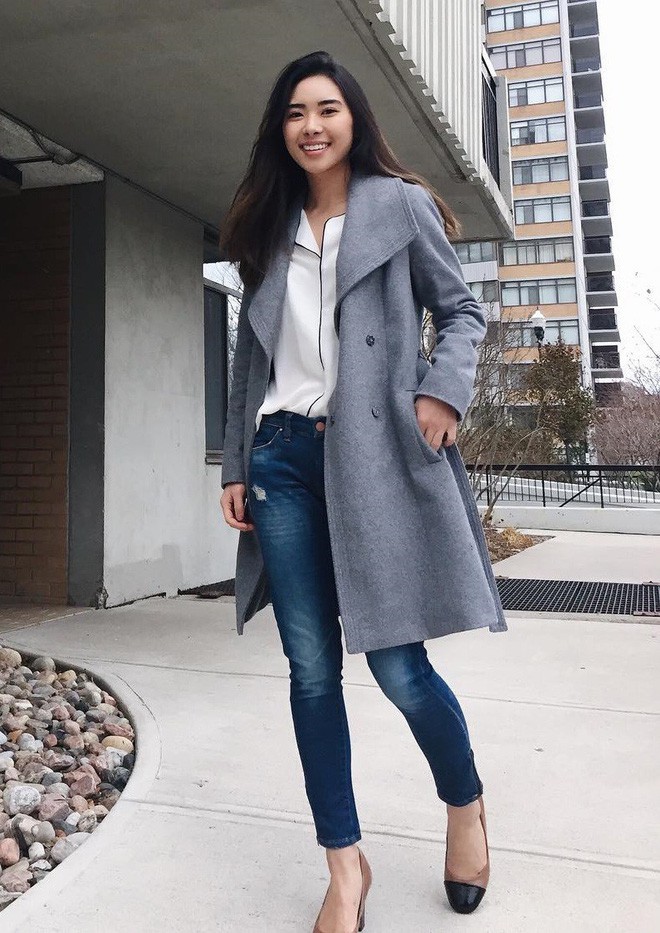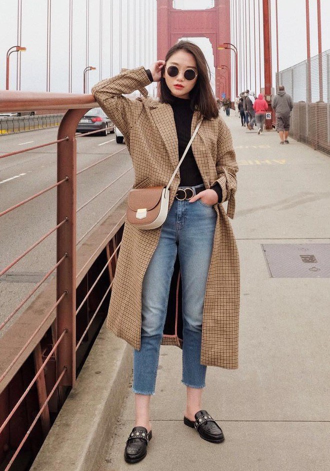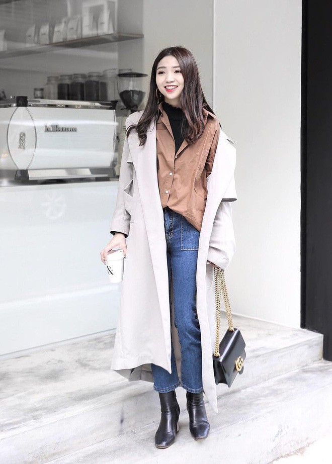 Cùng với quần skinny, quần jeans cũng là item đơn giản, dễ mặc mà bạn có thể kết hợp cùng áo khoác dáng dài. Nhất là với những cô nàng còn đang e ngại rằng áo khoác dáng dài sẽ dễ làm dìm dáng hoặc hơi "dừ", thì quần jeans sẽ là điểm nhấn trẻ trung làm mới cho set đồ của bạn. Ngoài những mẫu quần jeans cơ bản, bạn còn có thể chọn những mẫu quần jeans cách điệu như jeans xé gấu, jeans ống loe, jeans 2 màu… Set đồ này đảm bảo vừa có thể hợp để bạn diện chỉn chu khi đi làm, lẫn diện theo phong cách trẻ trung, cá tính khi đi chơi, dạo phố.