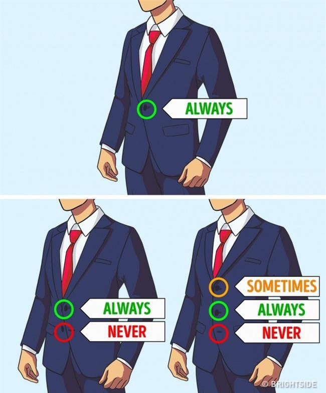 Với những bộ vest, để có được hình ảnh lịch lãm nhất, bạn tuyệt đối không buông khuy ở vị trí thứ 2. Đây là điều rất quan trọng nếu không muốn bộ vest không chuẩn phom và bản thân bị lộ khuyết điểm.