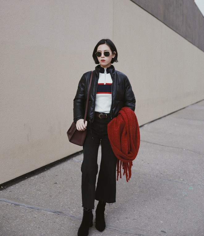Cách mix cơ bản nhất vẫn là diện cả set với toàn các item đỏ - đen, từ quần áo, giày dép tới phụ kiện. Tuy nhiên, nếu muốn set đồ của mình trông nhẹ nhàng hơn đôi chút, bạn có thể thêm một item màu trắng vào tổng thể, chẳng hạn như áo tshirt hay giày, khăn len đều ổn.