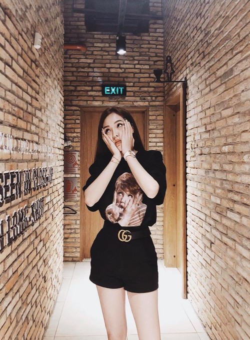 Và street style của người đẹp hiện giờ chỉ trung thành với mỗi kiểu áo thun đen có hình ngộ nghĩnh. Thương hiệu yêu thích của nàng hậu sành điệu hiện giờ là Gucci.