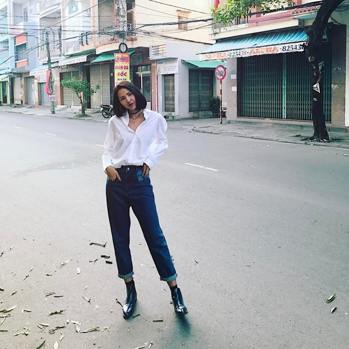 Chân dài Minh Triệu kết hợp dáng áo này với mom jeans cổ điển. Ngoài cách mix với chelsea boots như trong hình bạn có thể thay thế bằng giày cao gót hoặc loafer.