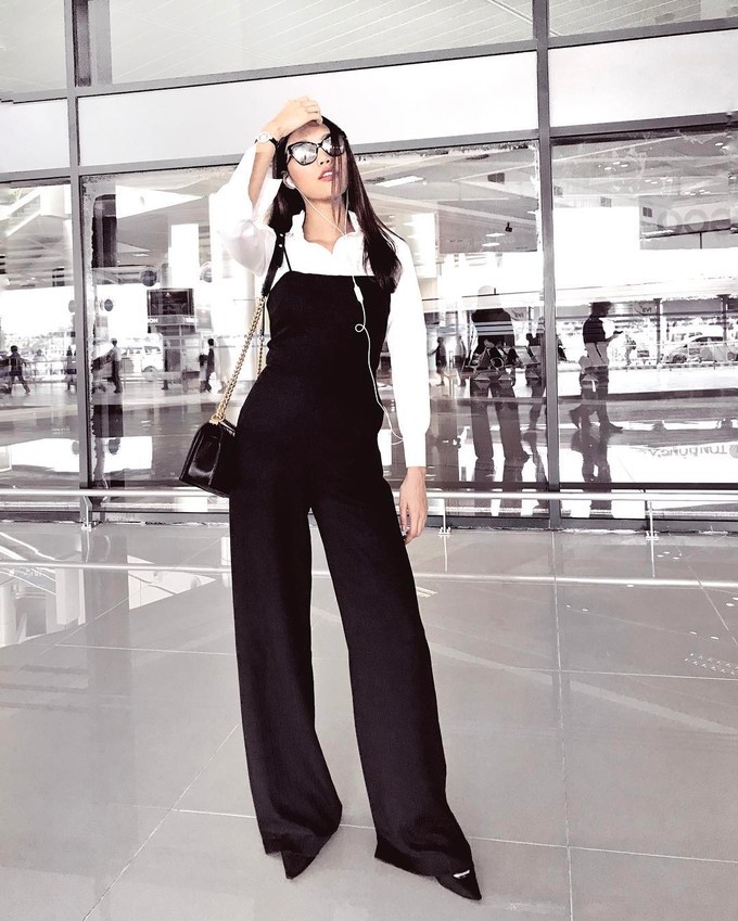 Dáng áo quen thuộc được chân dài Lan Khuê kết hợp ăn ý với jumpsuit hai dây.