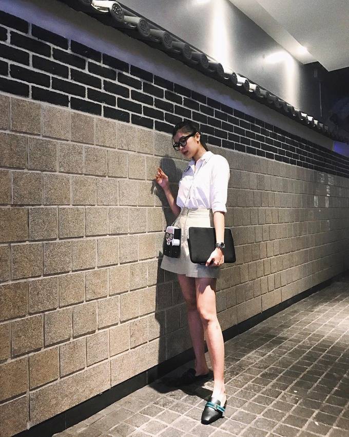 Sơ vin sơ mi cùng quần short như cô nàng Đồng Ánh Quỳnh là công thức đơn giản nhưng chưa bao giờ lỗi mốt. Bạn có thể diện set đồ này cùng giày loafer hay sneaker trong dịp tụ tập bạn bè cuối tuần.