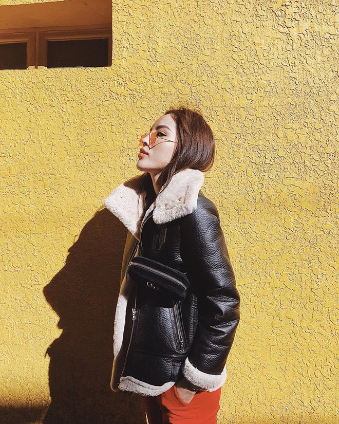 Kỳ Duyên vừa thời thượng vừa ấm áp khi chọn áo jacket da lót lông. Khác với Đỗ Mỹ Linh, áo jacket của Kỳ Duyên là áo da đen chứ không phải là áo trần bông.