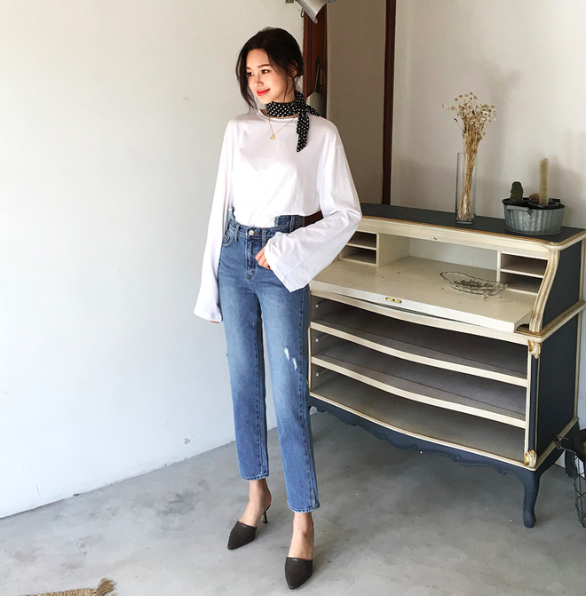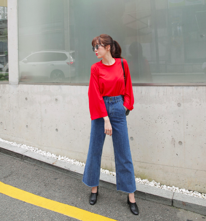 Một chiếc áo phông màu nổi sẽ là điểm nhấn sáng giá cho combo áo phông + quần jeans quen thuộc của các nàng. Bạn cũng đừng chỉ loanh quanh với những kiểu dáng quen thuộc của quần jeans, hãy phá cách một chút với những thiết kế jeans ống rộng, như vậy dù cho combo có đơn giản thế nào cũng trở nên khác biệt.
