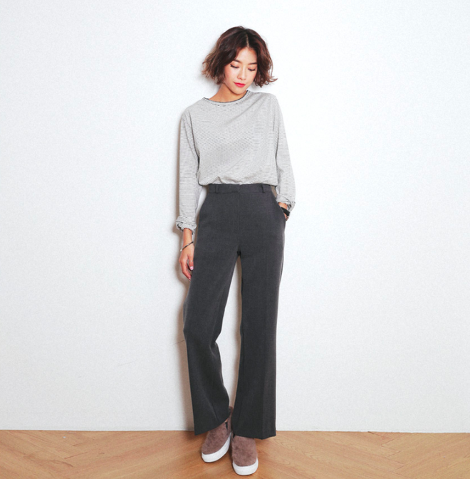 Cơ bản và dễ dàng nhất luôn là áo phông trơn mix cùng quần âu xuyệt tông trung tính. Chính sự nhẹ nhàng, đơn giản của hai món đồ lại vô tình tạo nét cá tính, khác biệt khi sóng đôi cùng nhau.