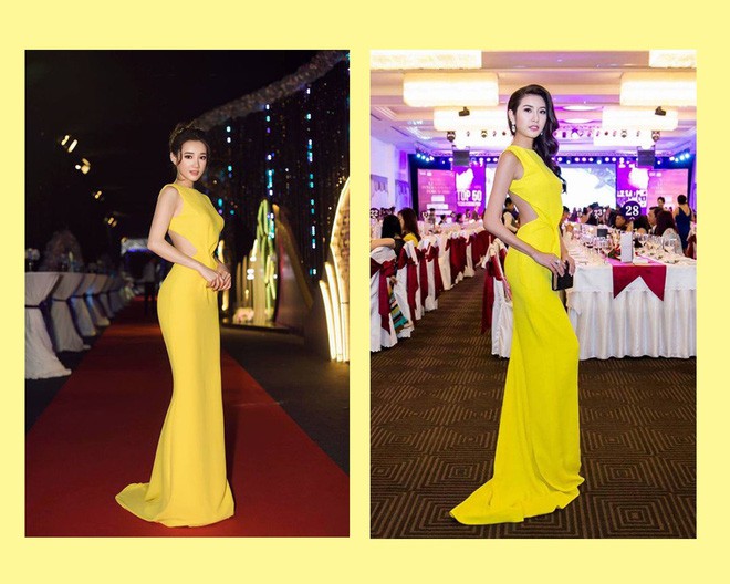 Đặt 2 bức ảnh cạnh nhau mà so sánh ai đẹp hơn ai thì quả thật rất phân vân, Thuý Vân với chiều cao vượt trội đương nhiên nàng Á hậu nhìn nổi bật hơn, nhưng Nhã Phương không hề kém thế khi diện thiết kế này. Nếu như chọn kiểu tóc xoăn xoã uốn như Thuý Vân chắc chắn chiều cao của Nhã Phương sẽ bị lấn át, chính vì thế nữ diễn viên Tuổi thanh xuân đã chọn kiểu tóc búi đầy sang trọng. Thế mới nói, chiếc váy mà Nhã Phương diện sẽ không biến thành tuyệt phẩm nếu như người đẹp chọn sai kiểu tóc.