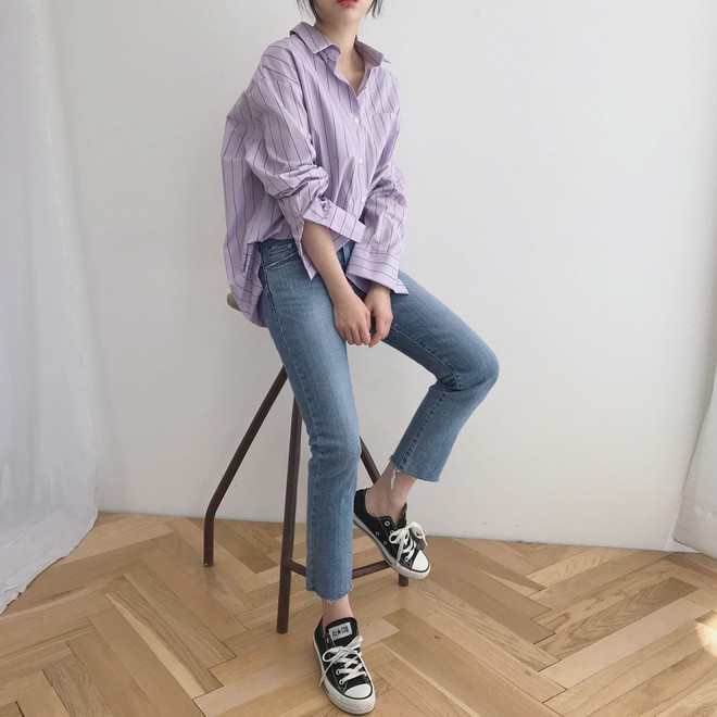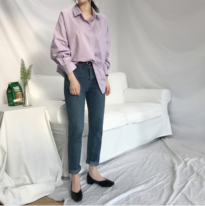 Nếu bạn mê diện áo sơ mi và đã diện miết mải sơ mi trắng, sơ mi xanh hay sơ mi kẻ sọc thì sơ mi màu tím lavender chính là item tuyệt vời để bạn "đổi gió". Tưởng "sến" nhưng khi diện lên, sơ mi tím lavender lại xinh xắn và trang nhã đến không ngờ, tựa như người họ hàng đầy mới mẻ của sơ mi xanh quen thuộc, vẫn nhẹ nhàng, dễ diện như vậy nhưng lại tươi tắn, nữ tính hơn và cũng có phần cá tính hơn. Sắc tím nhẹ nhàng nhưng nổi bật dễ trở thành điểm nhấn cho mọi set đồ, nhờ đó bạn có thể phối đồ thật đơn giản nhưng vẫn bắt mắt.