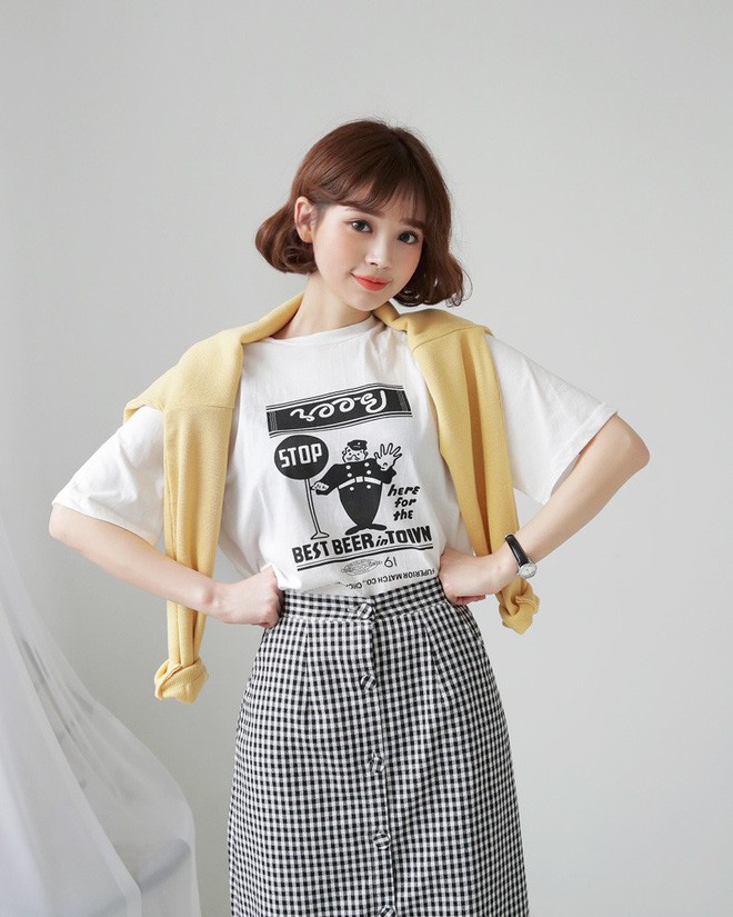 Thêm một gợi ý giúp cho set đồ với áo phông trắng bớt nhàm chán đó là bạn có thể chọn thêm chiếc áo len mỏng dáng ngắn để khoác hờ trên vai, y như một tiểu thư nước Pháp như thế này.