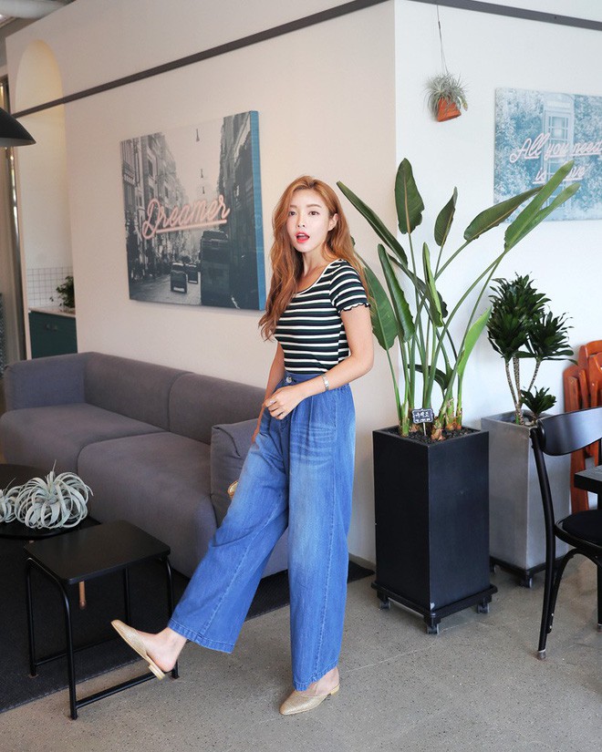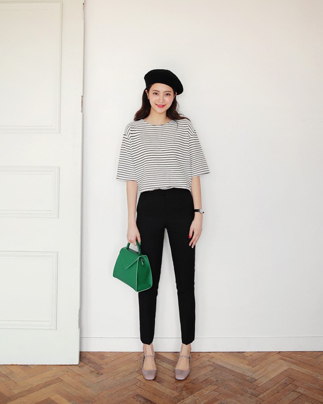 Cũng giống như áo phông trắng, áo phông kẻ ngang cũng dễ dàng kết hợp với nhiều kiểu quần, trong đó có quần culottes...