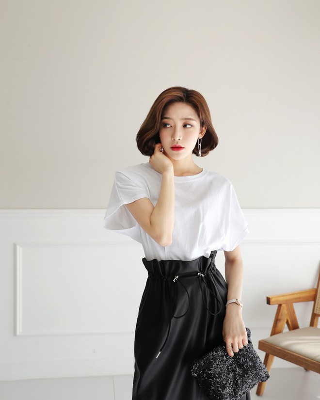 Chân váy cạp cao mix cùng áo phông trắng chưa bao giờ là sự lựa chọn lỗi mốt, chỉ cần thêm thắt một vài phụ kiện như khuyên tai, túi xách hay giày cao gót là bạn đã có set đồ hoàn chỉnh tới công sở rồi.