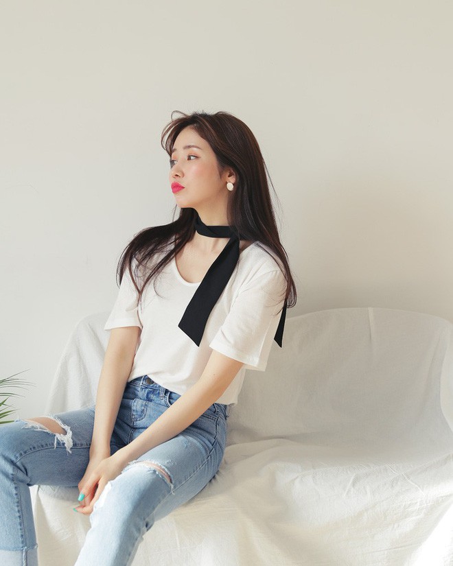 Nếu sợ áo phông trắng và quần jeans rách có phần hơi tẻ nhạt, vậy thì đừng bỏ qua phụ kiện khăn buộc cổ hay đơn giản là một chiếc vòng cổ choker nhé.