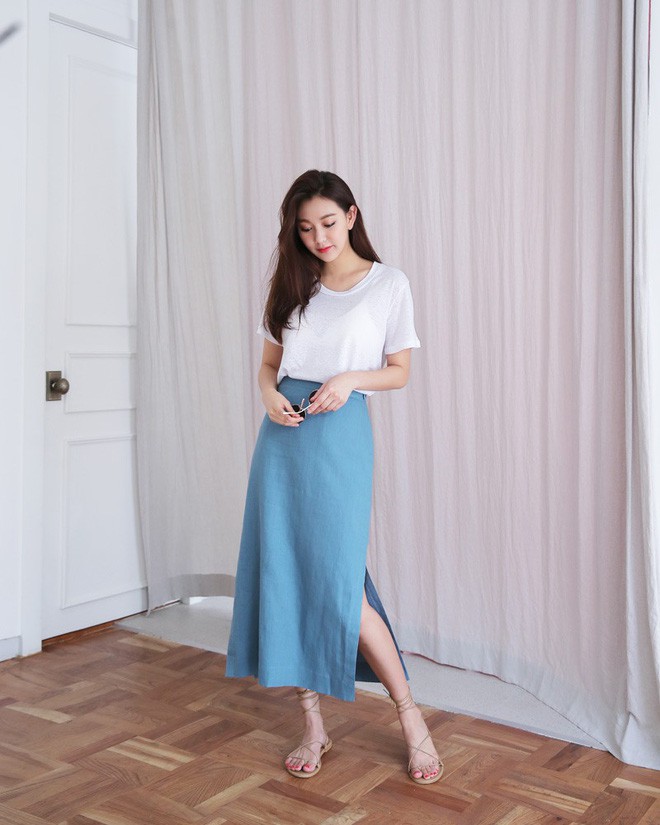 Một chiếc váy dài xẻ kết hợp cùng áo phông trắng, thêm một đôi sandals buộc dây - vậy là bạn đã có một set đồ hoàn hảo đi biển rồi đấy.