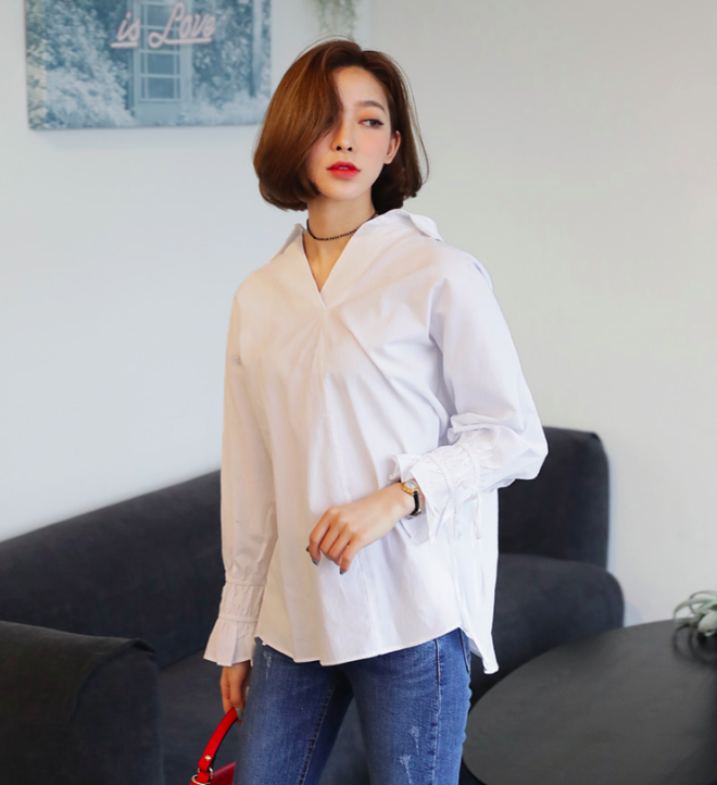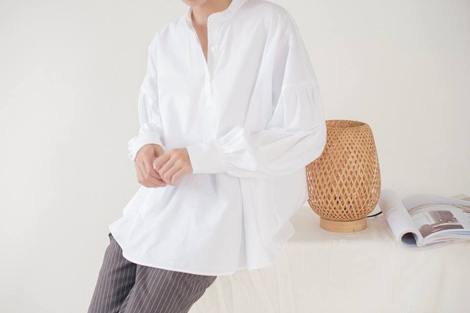Thiết kế của Item du jour ghi điểm tuyệt đối với kiểu dáng cổ V dáng oversizd xinh xắn. Sơmi trắng trơn cách điệu với tay bồng xuôi vai nhẹ nhàng càng giúp các nàng thêm xinh, thêm điệu khi diện áo. Thiết kế có giá 425 ngàn đồng.