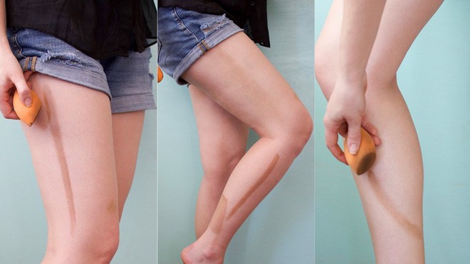 Dùng kem tạo khối với tông màu đậm hơn da để giúp cho đôi chân thon thả hơn. Bạn cần bôi kem ở vùng đùi trong, đùi ngoài, vẽ theo đường cong của bắp chân, sau đó dùng bông mút tán nhẹ cho màu lan đều.