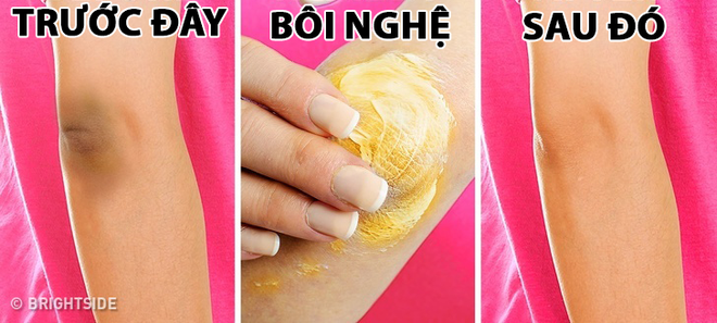 Cách làm: Trộn một ít bột nghệ với một thìa cà phê sữa tươi không đường. Tiếp sau, bôi nó lên đầu gối và khuỷu tay. Xoa đều lên vùng da và để khô tự nhiên. Cuối cùng rửa sạch lại bằng nước ấm. Để có thêm hiệu quả, bạn có thể thêm mật ong vào hỗn hợp.
