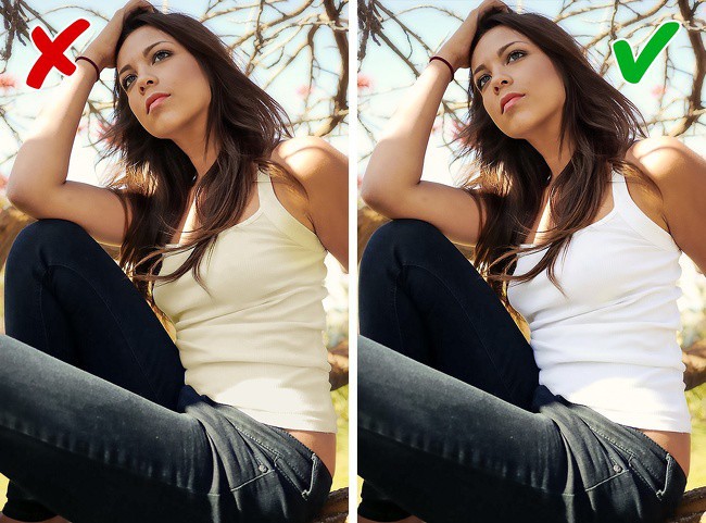 Nếu muốn mặc đồ trắng, hãy chọn đồ trắng tinh, không bị ngả vàng. Với đồ đã bị ố, hãy tẩy nó với nước tẩy, baking soda hoặc nước cốt chanh. Tuy nhiên, nếu áo đã bị ố vàng nhiều, bạn nên bỏ chúng đi.