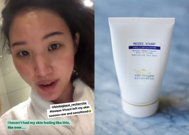 Liah Yoo chưa bao giờ gặp phải tình trạng da thế này, loại mặt nạ mà cô nàng đã dùng là Biologique recherche masque vivant (có giá khoảng 1,3 triệu VNĐ) - đây là loại mặt nạ dành cho da dầu với tác dụng giúp điều tiết dầu và làm sáng da, điểm nổi bật của sản phẩm này là có chứa nấm men, axit lactic giúp làm sáng da, giảm dầu và hạn chế mất nước. Tuy là sản phẩm nổi tiếng nhưng rất tiếc cho Liah Yoo lại bị kích ứng mẩn đỏ.