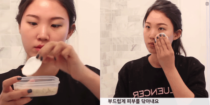 Liah Yoo sử dụng bông tẩy trang mềm để thoa nước yến mạch lên da.