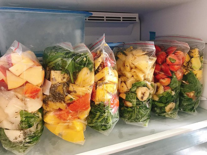 Minh Thanh chia sẻ: Cách làm những ly sinh tố giảm cân này vô cùng đơn giản. Thanh chọn cuối tuần đi siêu thị, gọt rửa sơ chế một lần luôn, sau đó chia sẵn ra bịch cho 6 ngày và cấp đông. Làm như này bạn sẽ thấy có đồ uống giảm cân rất nhanh gọn lẹ, sáng lấy một bịch ra xay trong vòng 5 phút là có ngay 3 ly cho 1 ngày.