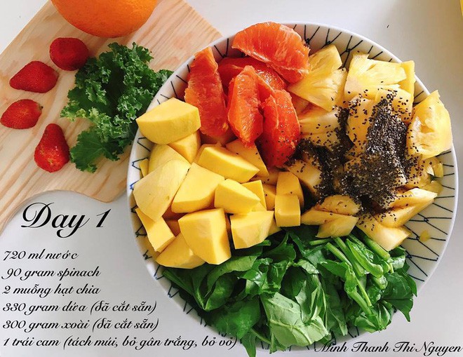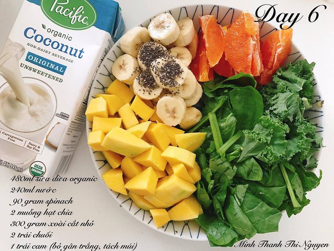 Ngày cuối cùng vẫn lượng sữa và nước như ngày thứ 5: 480ml sữa dừa organic và 240ml nước lọc, 90g cải bó xôi, 2 muỗng hạt chia, 300g xoài, 2 trái chuối và một trái cam.