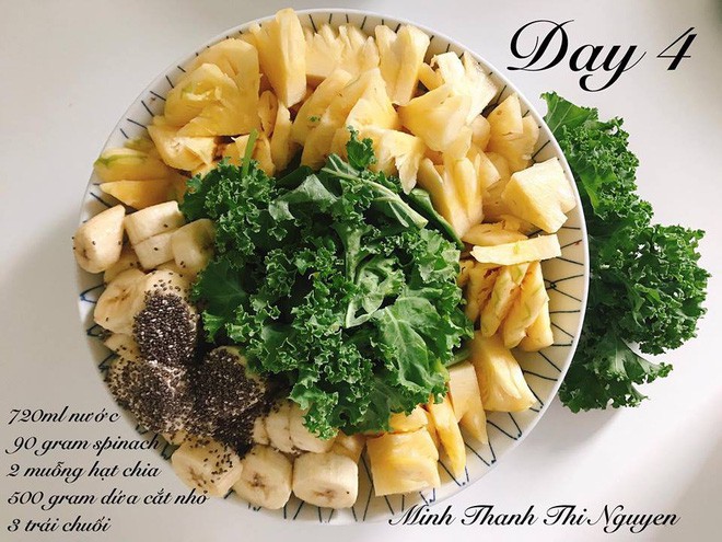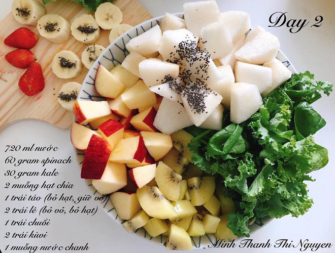 Ngày thứ hai, Minh Thanh sử dụng 720ml để trộn 60g cải bó xôi, 30g rau cải xoăn, 2 muỗng hạt chia, 1 trái táo, 2 trái lê, 1 trái chuối, 2 trái kiwi, 1 muống nước chanh.